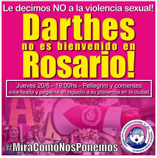 El actor, denunciado por acoso y violación, regresó al país tras pasar 6 meses en Brasil y se alojó en un barrio privado de la ciudad de Rosario. Sobre esta cuestión, Marina Boldrini, Coordinadora de la campaña por la Emergencia expresó: “Entendemos que está bien que vuelva a Argentina, que vuelva y se presente frente a la justicia. Pero nosotras no tenemos ni los tiempos ni la lógica de la justicia, no pedimos pruebas ni juzgamos a las víctimas, nosotras las entendemos y las acompañamos, porque todas fuimos o podemos ser Thelma” y destacó que este repudio “tiene dos aspectos, por un lado dejarle claro a cada violento que hay en la ciudad de Rosario, incluido Darthes, que no vamos a permitir esta violencia y mucho menos nos vamos a quedar en silencio, y por otro lado recordarle a cada una de esas mujeres que tuvieron la valentía impresionante de hablar, que no están solas, que nunca más van a estar solas, y que juntas vamos a cambiar todo lo que hay que cambiar para que cada una de nosotras pueda tener una vida libre digna y sin miedo.”
