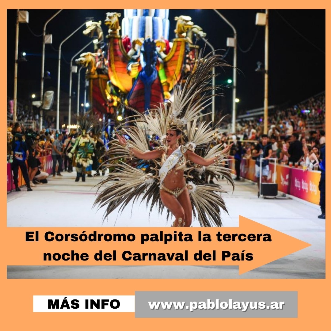 Este sábado 20 de enero será la tercera noche del Carnaval del País. Con el siguiente orden de salida: Kamarr (Club Sirio Libanés) que presenta “Chá, la revelación de la tierra”, O’Bahía con “Vuela” (Club de Pescadores), Papelitos (Club Juventud Unida) y su “Valké, ser nórdico antiguo del oeste” y en el cierre Marí Marí (Club Central Entrerriano) con su propuesta “Amanecer prometido”.