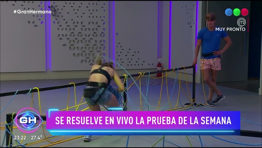 En esta ocasión, “deben atarse la soga al cinturón y desenredarla para llegar al otro extremo de la viga”, explicó el conductor. Más tarde, finalizó el programa con ellos aún en competencia y sin saber el resultado final.