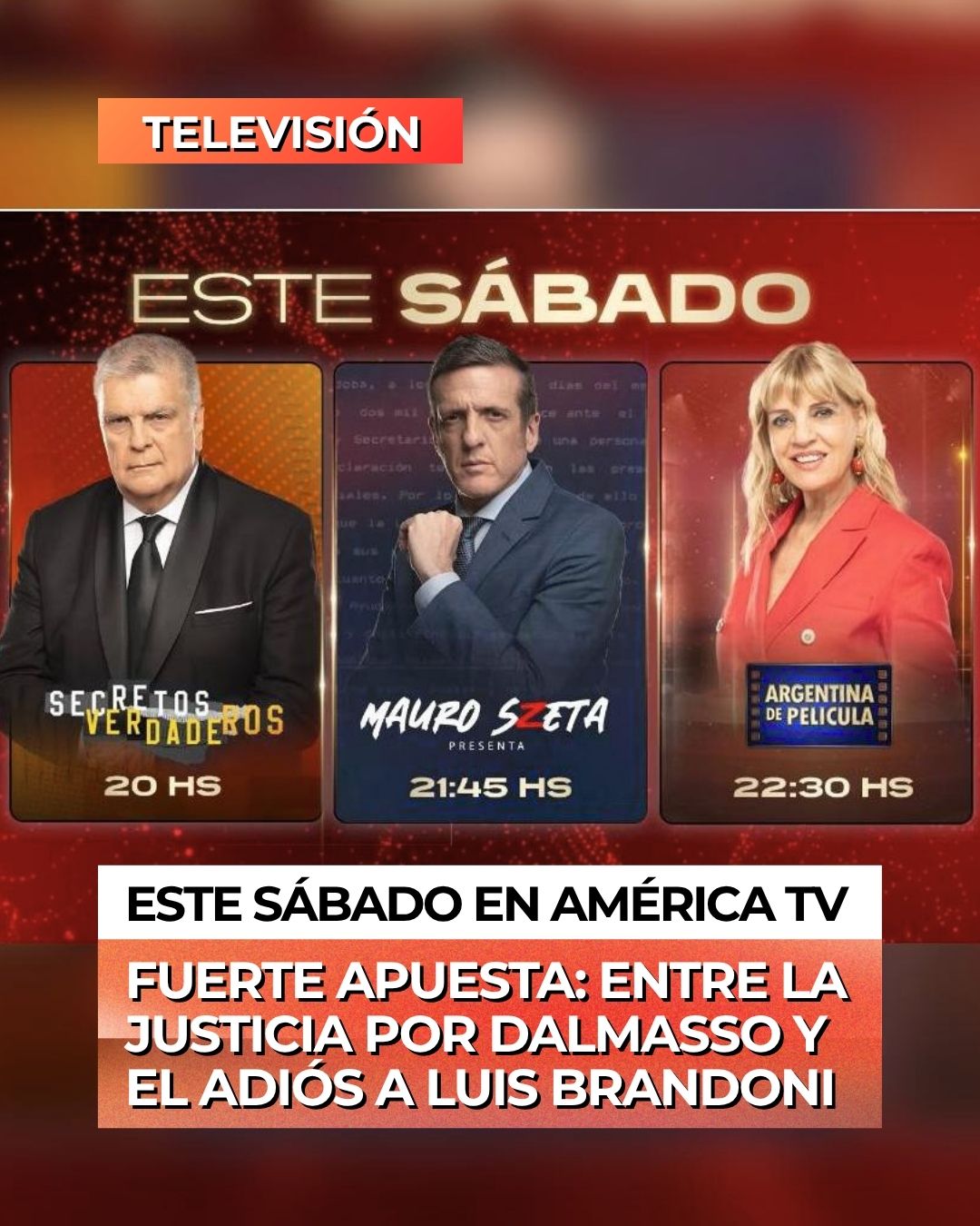 América TV renueva su horario central este sábado con una propuesta que combina el rigor periodístico y el tributo emocional. La señal pondrá en pantalla una entrevista exclusiva de Mauro Szeta con la familia Macarrón, quienes aportarán revelaciones inéditas sobre el ADN en el caso Nora Dalmasso. Además, la programación rendirá un homenaje especial a la trayectoria de Luis Brandoni tras su fallecimiento, con una emisión dedicada a su legado y la proyección de su última gran obra cinematográfica.