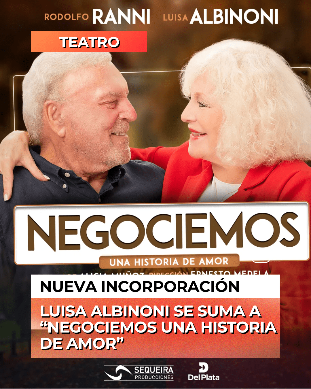 “Negociemos… Una historia de amor” atraviesa una nueva etapa con la incorporación de Luisa Albinoni al elenco, quien se suma como protagonista femenina junto a Rodolfo Ranni. La obra, escrita por Alicia Muñoz, dirigida por Ernesto Medela y la producción de Damián Sequeira, continúa su recorrido con un renovado impulso a partir de este encuentro escénico entre dos figuras emblemáticas.