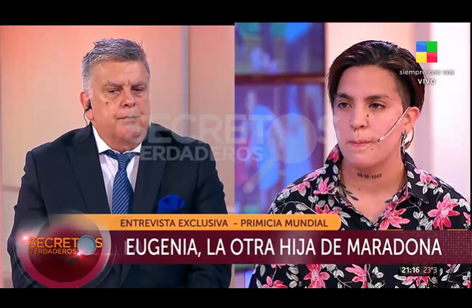 Por primera vez, la joven de 25 años, oriunda de La Plata y dada en adopción por su madre biológica, habló con el periodista en el piso de «Secretos Verdaderos» y recordó la travesía que comenzó cuando su papá adoptivo le contó que el Diez podría ser su padre biológico.