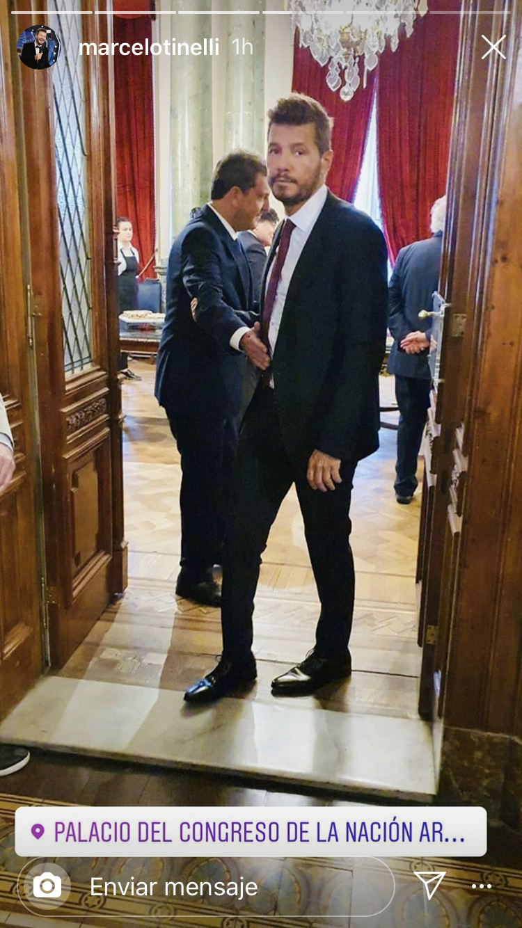 Un día después, con un traje negro, camisa blanca y corbata oscura, el empresario escuchó el discurso al lado de Malena Galmarini, la presidenta de Aysa y esposa de Sergio Massa y mujer de Massa. El conductor había hecho público su apoyo al gobierno de Alberto Fernández y en noviembre pasado fue convocado para participar del Consejo contra el Hambre, impulsado por el presidente.