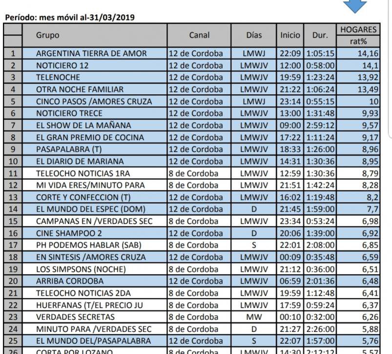 Rating. Canal 12 de Córdoba líder absoluto
