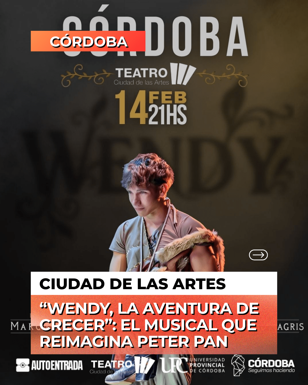 “Wendy, la aventura de crecer” es un musical innovador que propone una relectura contemporánea de la clásica historia de Peter Pan, poniendo el foco en Wendy y en el desafío emocional de crecer sin perder la magia. La producción llega a Córdoba con una única función el sábado 14 de febrero de 2026, a las 21 horas, en el Teatro Ciudad de las Artes.